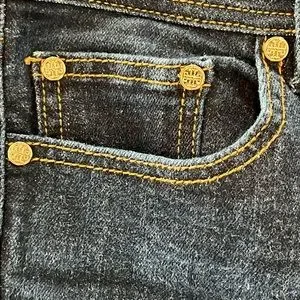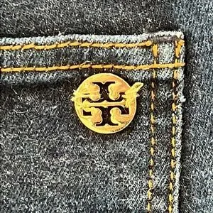 Classic Tory Burch ladies denim jeans, size 25. Double T gold tone hardware… robots, button, logo. Front zipper closure. 2 front pockets, coin pocket, 2 rear pockets, belt loops. Dark wash, some stretch, excellent condition. Waist 13.75@, rise 8”, length 40”.