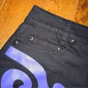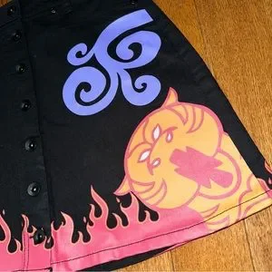 Black a line mini denim skirt. Hot Topic Her Universe Disney Aladdin collection. Magic Carpet flames and tiger design. Buttons down the front. Belt loops. Four pockets.