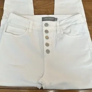 JUST USA white button fly jeans. In great used condition. Size 8. 26% cotton - 54% rayon - 19% polyester - 1% spandex.