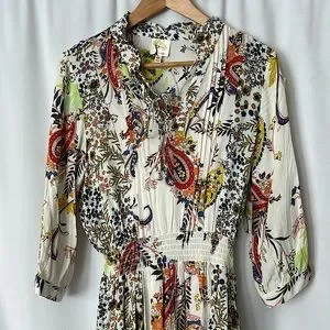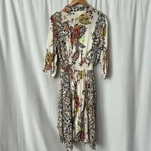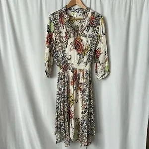 Beautiful Boho Fig and Flower Cream Floral 3/4 Sleeve Uneven Hem Dress. Size M.