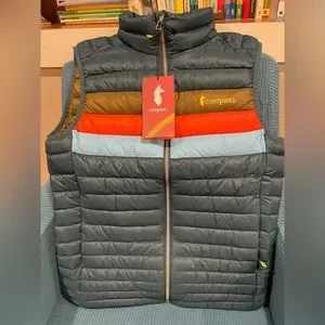 Brand new with tags. I bought it for my husband but it doesn’t fit him. The Cotopaxi brand is awesome and this Fuego stripes retro look vest is great! Colors are an amazing deep blue, light blue, orange, and olive army greenish. Great for all seasons. Gear for good! Retails for $185 new. Hard color to find.