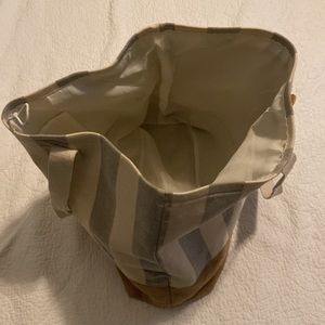 Gray & White Striped and Straw Base Beach Tote Bag. Two Straps with a Button and Loop Closure. Inside pocket in lining. Measures 20”W x 15”H. 41% Polyester, 34%Cotton, 25% Rayon. Minor stains on inside lining.