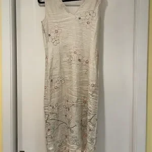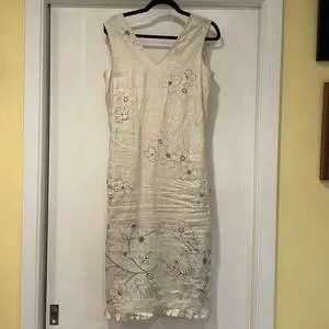 Adorable shift dress with a fun pleated hemline and lovely embroidery on front and back. Side zip, unlined, no pockets.