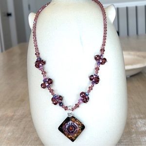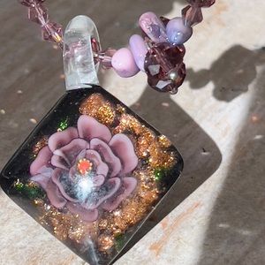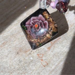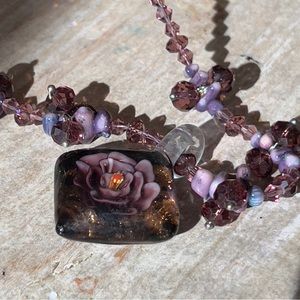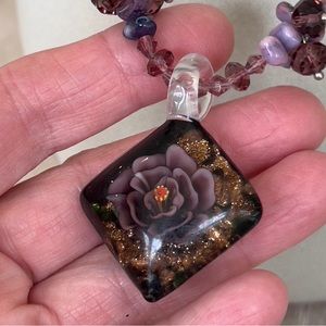 NEXKLACE AND EARRING SET purple and gold handmade glass and resin flowers