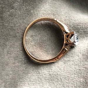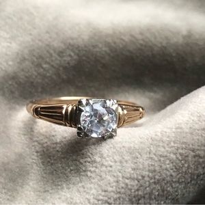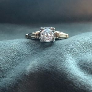 Size 5.75, the center stone is not diamond, I believe it is a 4mm white sapphire. You can easily replace the stone with a 0.25 carat diamond or any other gem stones. It has really delicate details on the side and are not at all worn out. It is a beautiful antique!