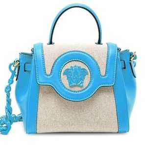 otton canvas and grained leather constructs this Italian made bag, decorated with Versace's signature Medusa emblem.A lightweight chain strap accompanies the accessory for hands-free sophistication.