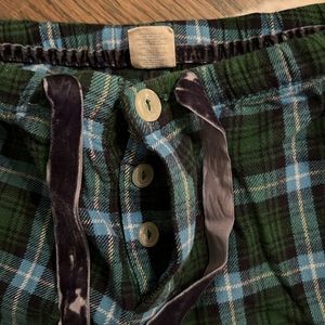 Great condition, blue n green plaid, flannel pj bottoms, button fly, blue velvet drawstring tie, no stains, tears, rips, fraying, etc. smoke free /pet free home. Make an offer!