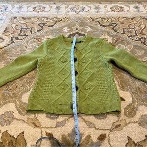 Darling British cardigan with button front and 3/4 sleeves in washable wool. Lovely lime green color. Five buttons down the front placket. Super soft and washable. Size 10 UK which is a size 6 US. See photos for measurements. Worn once and washed. Smoke, free pet free home.