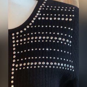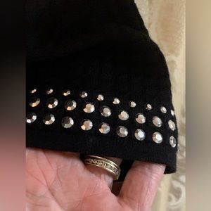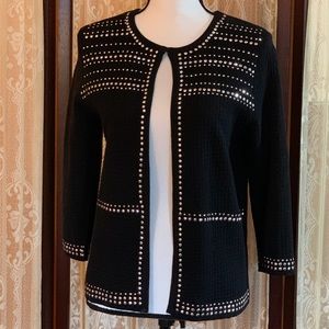 Alfred Dunner black waffle texture open front cardigan in a size petite medium. It has a hook and eye closure. Silver accents on front. Material is 55% cotton and 45% acrylic. It measures approx. 18 1/2” pit to pit and 23” shoulder to hem. Very good preowned condition.