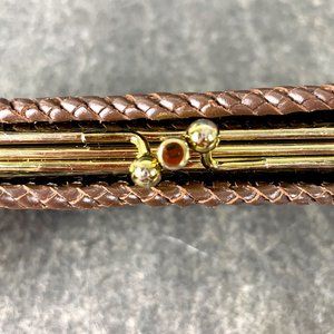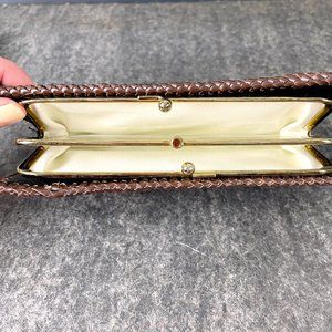Vintage hand made brown tooled clutch/wallet. Hand tooled by Lew Crocker. Floral design, monogrammed with P.S.C. Brown leather laced edging. 2 gold tone metal framed interior compartments separated by framed clear plastic with tight kiss clasp. Snap closure sides, one with 2 bill pockets, the other with one bill pocket, a credit card pocket and a license pocket. Interior is black leather.