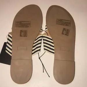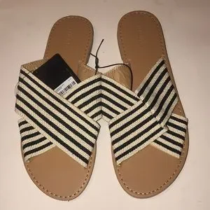 Women’s brand new X-band flat sandals. Two textured black & ivory striped bands crisscross across the footbed. Easy to wear—-just slide your foot in! Perfect for the beach. Gum bottom sole with flat heel. Sz 8.5.