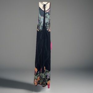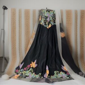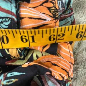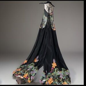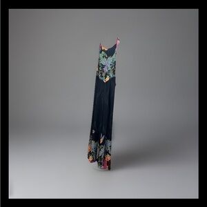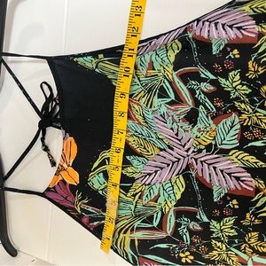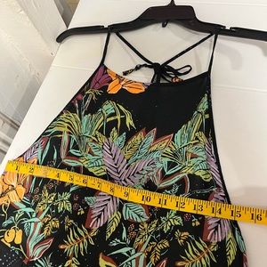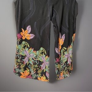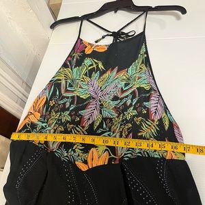 Black flowers pink white green tie in back black lace on back Flowy length 62’ waist 17’ chest 15’ dotted spots lined down pant leg flowers tropical design on top and bottom bell bottom legs, spaghetti strap, neck line, Razorback romper
