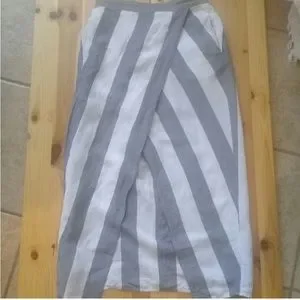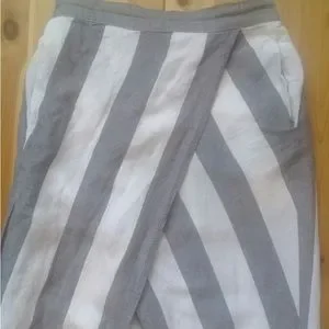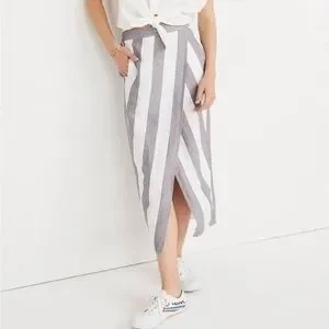 Madewell grey and white stripped linen skirt with overlap wrapped drapping. Sean just right to prevent gapping. Soft linen fabric. Waists has elastic on the back half. 2 hidden slit pockets. Waists approximately 12”, length approximately 31”.
