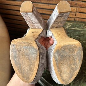 The upper of these shoes is in good condition. The sole is dirty but the heel tips are not worn down. Flaws: the heel insole is rising from the shoe in the arch, it is attached otherwise. The toe area fabric is dirty in the area that would be hidden by your toes. There’s one dirt spot smaller than a ladybug in the front of the platform as pictured.