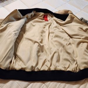 Floral Brocade Bomber Jacket, size Small. Never worn, no tags. Light blue with colorful embroidered flowers. Banded wrists and collar in black and cream. Cream stripe down center of sleeve.