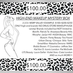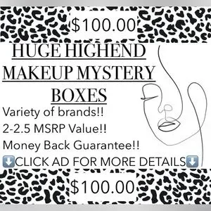 - Product types include but are not limited to: mascara, blush, highlighter, eyeshadow palettes, lipstick, liquid lipstick, lip gloss, bronzer, lip liner, single shadows, eyeliner, makeup merch (IE: bags, tshirts, socks ect!) from multiple brands, brushes and brush sets!! I also have skincare products if you’d like me to add some of those to your box upon request!!