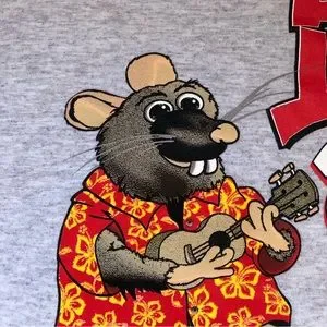 Hawaiian rat chilling in a red and yellow hibiscus shirt with red slippahs and playing his ukulele.