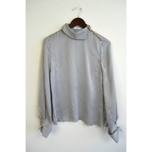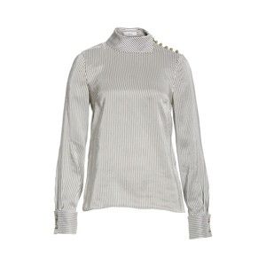 Slender pinstripes in soft grey and white add classic charm to a luminous silk blouse secured with a row of gleaming goldtone buttons at the shoulder.