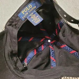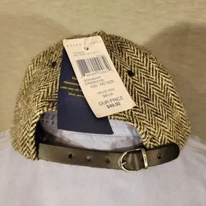 NWT Ralph Lauren Polo black and white wool herringbone tweed cap with black leather visor. Leather strap with logo buckle at the back. Striped tape at inner seams. Small scuff on visor, never worn.