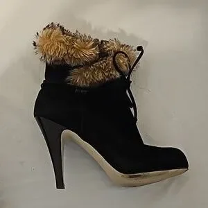 Black suede bootie with faux fur with tie around ankle. 4.5" heel 1" platform LIKE NEW