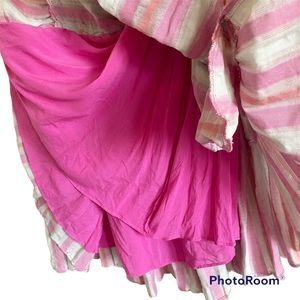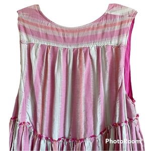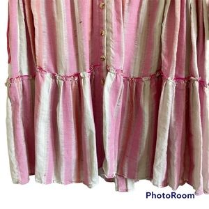 2 inseam side pockets, oversized, shapeless fit, plunging V neckline, button front closure, smocked bodice, tiered at front and back, deep armholes