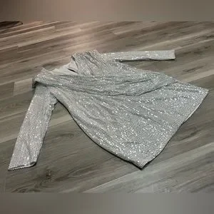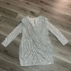 Brand new silver dress. Long sleeves, V neck, slit in back with button