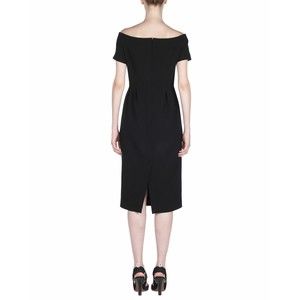 Tucked pleats and a seamed waist accentuate the feminine figure in a wool-crepe dress that balances its clavicle-baring neckline with a below-the-knee hem. Hidden back-zip closure. Off-the-shoulder neckline.