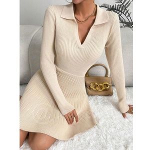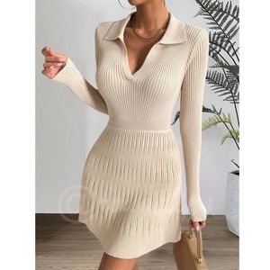 Beige Rib Knit Ruffle Hem V-Neck Mini Dress Collared Long Sleeve Stretchy