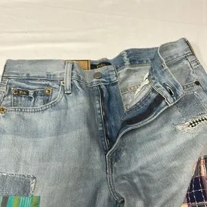 Inspired by Polo's signature pattern play, this version of our Avery Boyfriend is detailed with madras, gingham and plaid patches embroidered all over. The relaxed silhouette is crafted from right-hand twill and marked with rips and repairs..