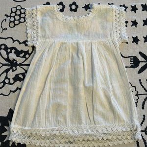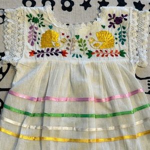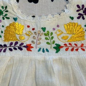 Well loved and worn Adorable little embroidered peasant dress with birds and d flowers. So cute! Good condition some slight discoloration on the from of skirt seen in photos. Very faint and not noticeable on, may even lift I haven’t trued. A bit of fraying in the crochet arms. Still very cute. No size tag it’s about a 2T.