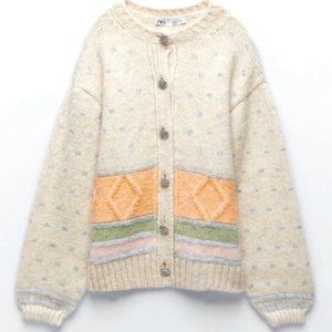 Zara Jewel Cream Pastel Button Jacket Cardigan Knit Oversized Medium