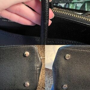 ⭐️HOST PICK DESIGNER POSH PARTY 11/15/24⭐️ Kate Spade ♠️ Margaux medium satchel bag. Triple compartment satchel with center zip. Black pebbled leather with tan/cream Saffiano leather interior. Spade tag adornment. One zippered interior pocket and one buttoned interior pocket in center section. Comes with crossbody strap. Wear and tear on the handles, hook for crossbody strap, crossbody strap clips, and metal feet (see last two photos for all examples). Measures about 12.75 inches long, 9.75 inches high, and 6 inches wide. Comes with dust bag. ❗️Sorry, I do not trade.❗️