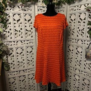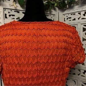 SHARAGANO Like new! Delightful dark orange knit short sleeve fit & flare plus midi dress, gotta love the awesome color & style, fitted top & full flared skirt, knit fabric with raised deco embroidered type look, silky inner lining, comfort poly/spandex stretchy, no snags tears or discoloration, see all pics per additional description… approx measurements below