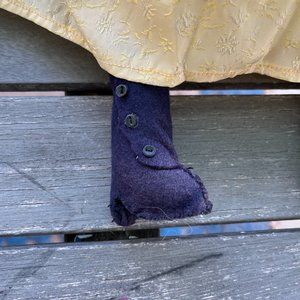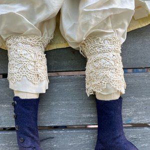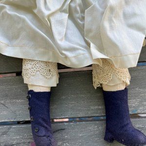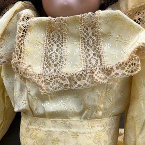 Circa 1910, this is an Armande Marseille doll from Germany, named Queen Louise. Bisque face with eyes that open and close and long eyelashes. Wavy brownish red hair in curls. Yellow dress with lace, bodice, elastic long sleeves, and from apron type collar. Linen petticoat underneath dress, and silk pantalons with lace on bottom. Black felt boots with 4 black buttons. Beautiful collector's item.