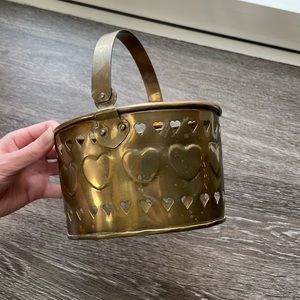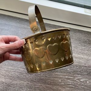 Vintage Solid Brass Basket with Hinged Handle and Heart Cutouts