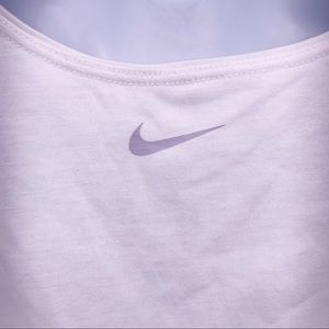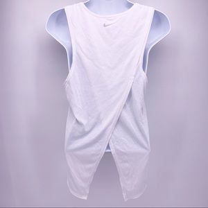 Nike Dri-Fit Peace Love Swoosh White Tank Top. Crossed back.
