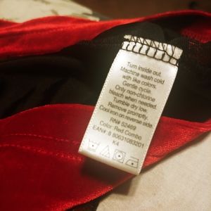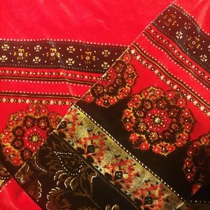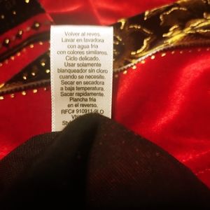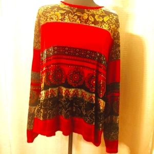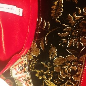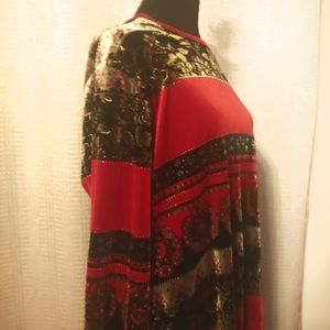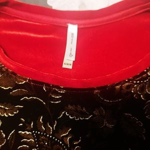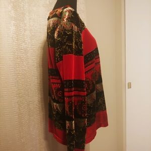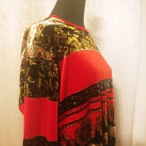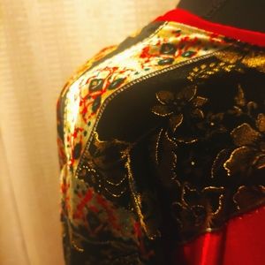 This is not your average top! Long sleeve, unique vintage velvety velour feel. Shiny gold and black patterned red shirt. Has a lil bit of stretch. Could definitely make a statement. Would go good underneath a blazer with the brilliant color of it popping out, or by itself with all the interesting patterns. This is unique and a lil crazy, have fun wearing this artistic piece. :)