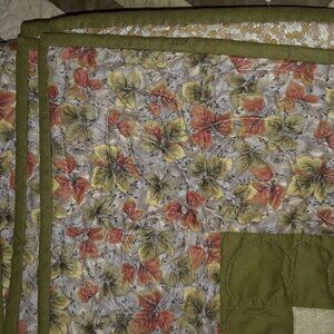 Hand-stitching is 8 stiches per inch & includes several sections with sewn botanical designs...see photos. The boarder features a gold-green/rust-green leaf print with a hand-stitched wave decoration. The reverse side features a pattern of curly cues in hues of olive & gold greens that is so pretty, it can also be used as the primary bed cover.
