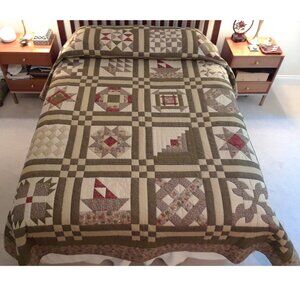 This GORGEOUS queen size hand-stitched Amish quilt features solid & botanical printed fabrics in shades of green, rust, brown & tan giving a cozy, earthy feeling. The design is an impressive Sampler array of 20 framed quilt patterns, each is 11 1/4 inches square.