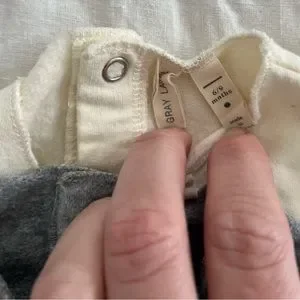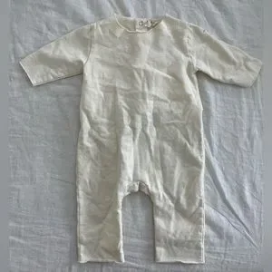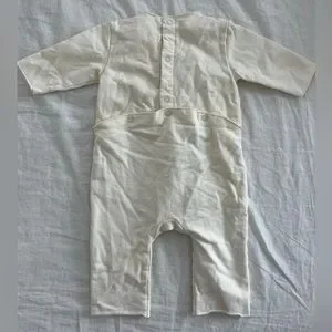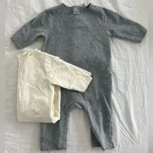 cream and gray, long sleeved with snaps down and across back. very high quality organic cotton, thick and fleeced inside. No signs of wear, size 6-9 months.