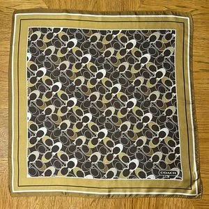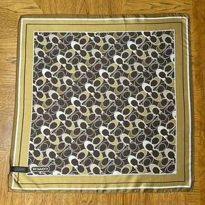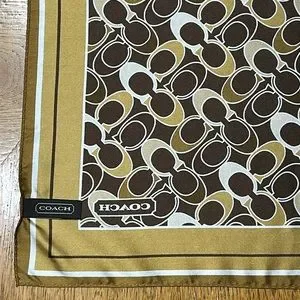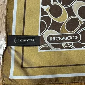 Gold, brown and bronze colored Coach Signature Silk Scarf. Has one small run shown in pictures but no snags or stains. Size 21” x 21”.