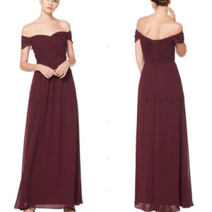 Off the shoulder sweetheart chiffon bridesmaid gown or prom dress with a criss-cross ruched pleated bodice, ruched cap sleeves, and soft front gathers on the A-line skirt.