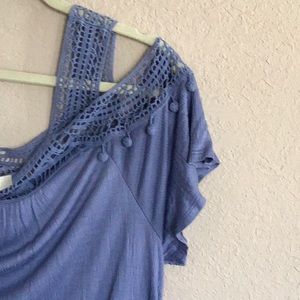 Blue draped and detailed cold shoulder top with lace and Pom Pom detailing. Super feminine! Worn maybe 2x. Measurements at 28 length and 40 bust with stretch give. Super soft and lightweight. There’s nothing not to love about it.