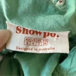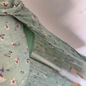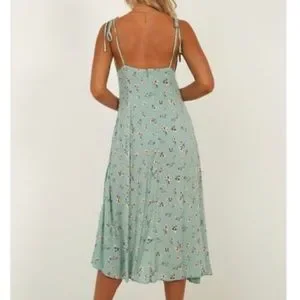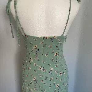 Champion Spirit Dress in sage floral. V neckline and ties to adjust straps. Slit in front