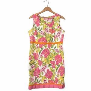 New without tag!! Sheath style dress. Bright, floral sleeveless dress. Orange ribbon detail around waist. Ruffle bottom hem. Zipper back closure.