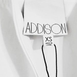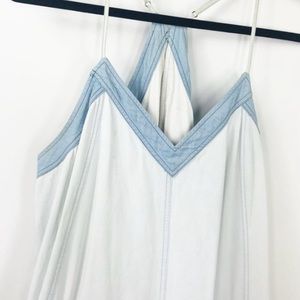 ADDISON Wyton A-Line Racerback V-Neck Light Wash Chambray Dress. Brand new with tags. Tag size XS, fits true to size. This shoulder-baring, soft chambray dress by ADDISON features contrast trim detailing along the neckline.