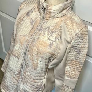 Size XL, with a pinkish tan marbleized print. Water repellent outer shell fabric and exterior storm flap, two zipper pockets in front. PrimaLoft Gold Insulation Eco traps body heat and repels water for warm, dry protection.Measures 21.5 inches pit to pit, 20 inches at the waist, laying flat with no stretch. This material is very stretchy and it's a cozy yet lightweight jacket! No stains or rips, ready to ship!