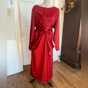 This red Eloquii dress is a show-stopper. Long sleeves, hem falls to about mid-calf length. Measurements listed below. With the front wrap ties, you can really show off your curves. The satin stretchy material drapes beautifully to hug you in all the right places, AND creates 2 front drape pockets for when you don’t quite know what to do with your hands at that winter formal. ❤️ Here at FGSS, we’ve got you covered 😉