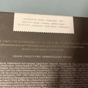Complex Culture, Full time, Eyeshadow Palette, Edit 2. Silky blendable shades curated for work and play. Full size. 0.48OZ. Nine shades total. 1.) Honey 2.) Bright Gold 3.) Bark 4.) Peach 5.) Nutmeg 6.) Golden Copper 7.) Warm Rose 8.) Black Cherry 9.) Taupe Glow. This item is brand new and unused. It comes in original packaging. Expires 36mos after opening.