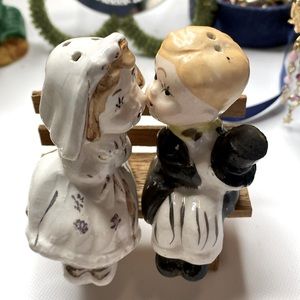 Little Bride and Groom salt and pepper shakers , Kissing couple all three pieces marked Japan